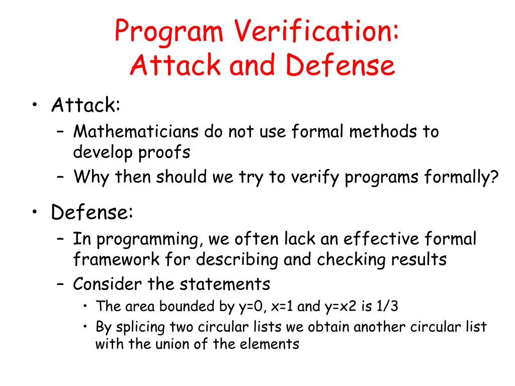 Program Verification: Attack and Defense • Attack: • Mathematicians do not use formal methods to develop proofs • Why then should we try to verify programs formally? • Defense: • In programming, we often lack an effective formal framework for describing and checking results • Consider the statements • The area bounded by y=0, x=1 and y=x2 is 1/3 • By splicing two circular lists we obtain another circular list with the union of the elements