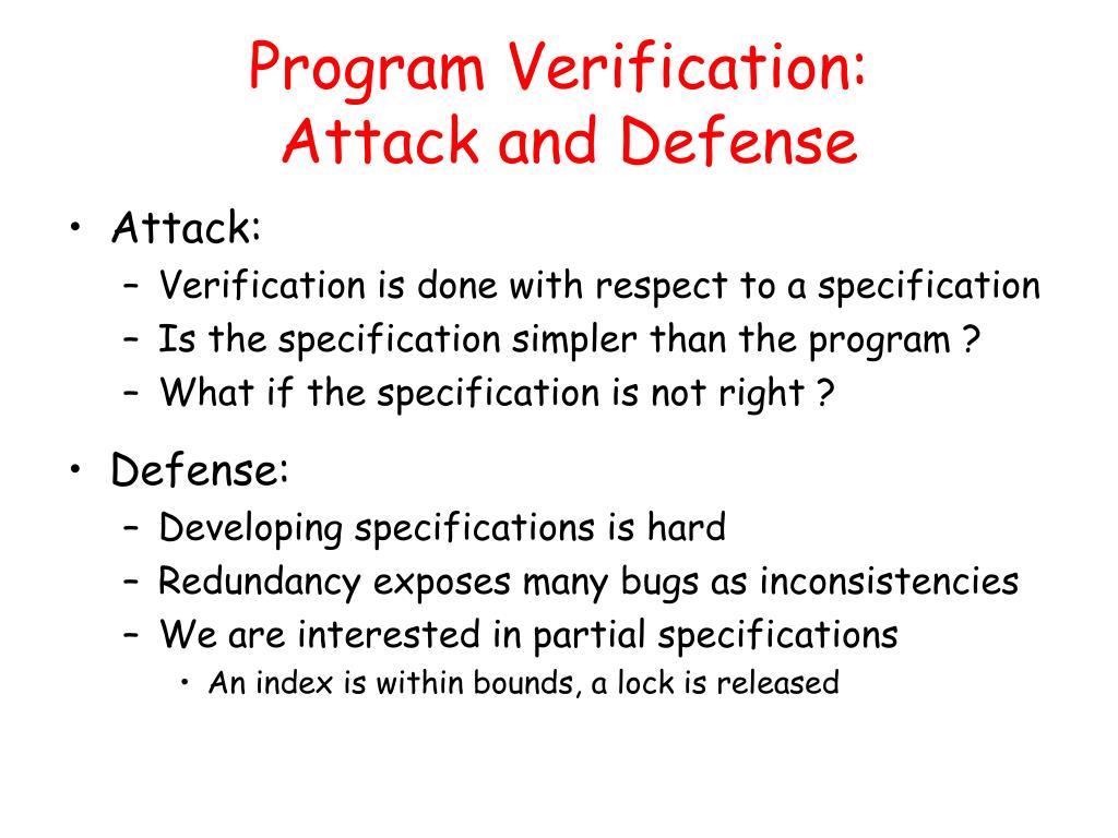 Program Verification: Attack and Defense • Attack: • Verification is done with respect to a specification • Is the specification simpler than the program ? • What if the specification is not right ? • Defense: • Developing specifications is hard • Redundancy exposes many bugs as inconsistencies • We are interested in partial specifications • An index is within bounds, a lock is released