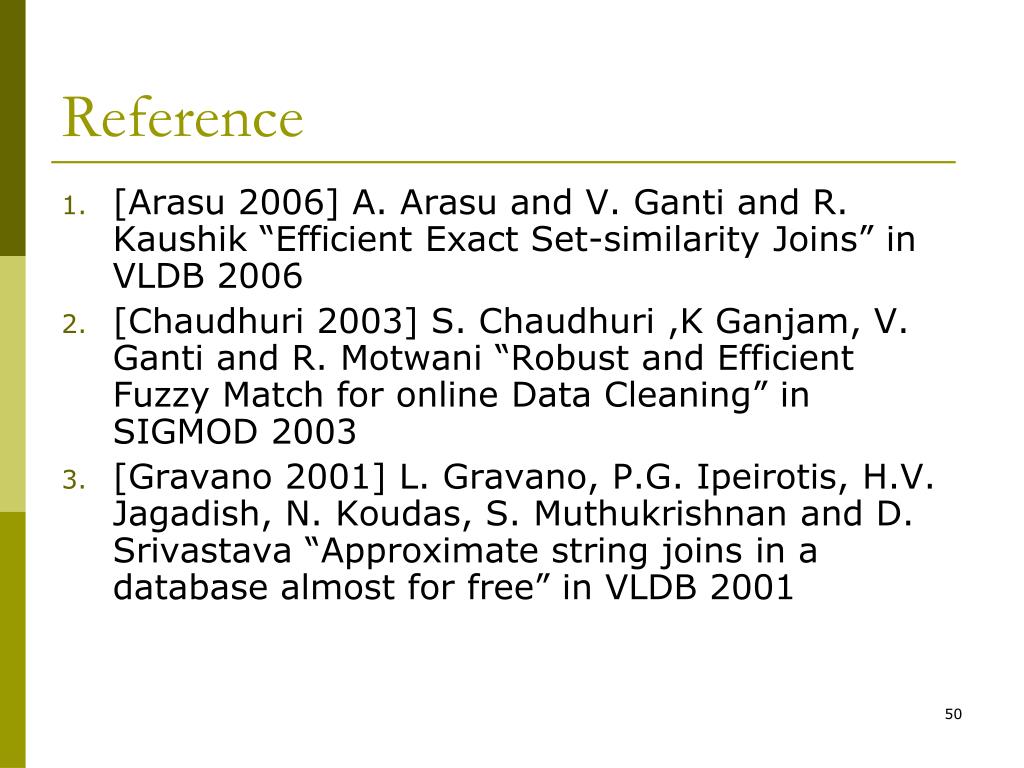 Reference • [Arasu 2006] A. Arasu and V. Ganti and R. Kaushik “Efficient Exact Set-similarity Joins” in VLDB 2006 • [Chaudhuri 2003] S. Chaudhuri ,K Ganjam, V. Ganti and R. Motwani “Robust and Efficient Fuzzy Match for online Data Cleaning” in SIGMOD 2003 • [Gravano 2001] L. Gravano, P.G. Ipeirotis, H.V. Jagadish, N. Koudas, S. Muthukrishnan and D. Srivastava “Approximate string joins in a database almost for free” in VLDB 2001