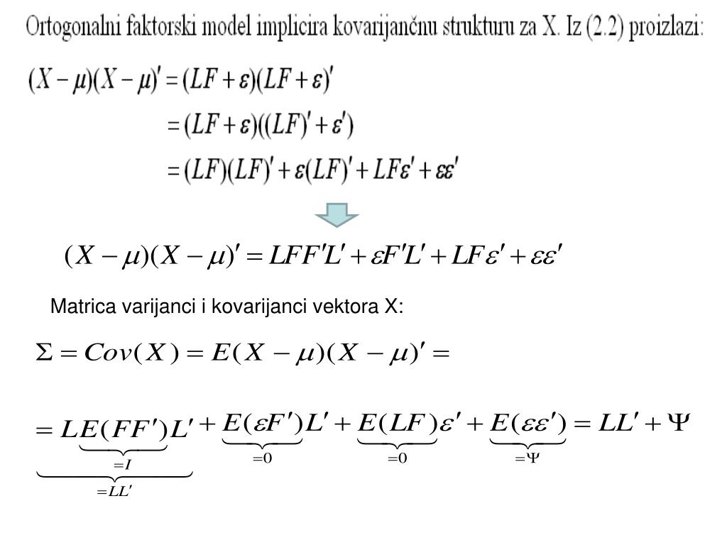 U modelu (2.1) p odstupanja izvornih varijabli izraženo je pomoću p+m neopservabilnih slučajnih varijabli (m zajedničkih i p specifičnih faktora). Tu je razlika između faktorskog modela i modela multiple linearne regresije. U regresijskom modelu nezavisne varijable (čije je mjesto u modelu (2.1) popunjeno zajedničkim faktorima) su opservabilne. • Polazne pretpostavke i relacija (2.2) određuju ortogonalni faktorski model s m zajedničkih faktora:
