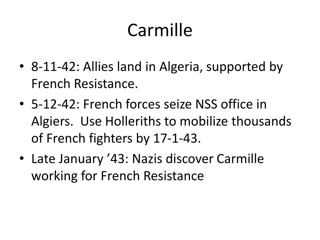Carmille • 8-11-42: Allies land in Algeria, supported by French Resistance. • 5-12-42: French forces seize NSS office in Algiers. Use Holleriths to mobilize thousands of French fighters by 17-1-43. • Late January ’43: Nazis discover Carmille working for French Resistance