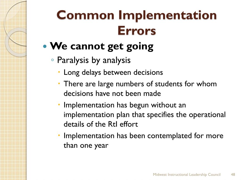 Common Implementation Errors • We cannot get going • Paralysis by analysis • Long delays between decisions • There are large numbers of students for whom decisions have not been made • Implementation has begun without an implementation plan that specifies the operational details of the RtI effort • Implementation has been contemplated for more than one year Midwest Instructional Leadership Council