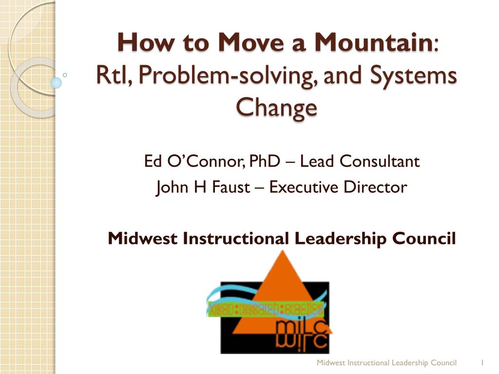 How to Move a Mountain: RtI, Problem-solving, and Systems Change Ed O’Connor, PhD – Lead Consultant John H Faust – Executive Director Midwest Instructional Leadership Council Midwest Instructional Leadership Council