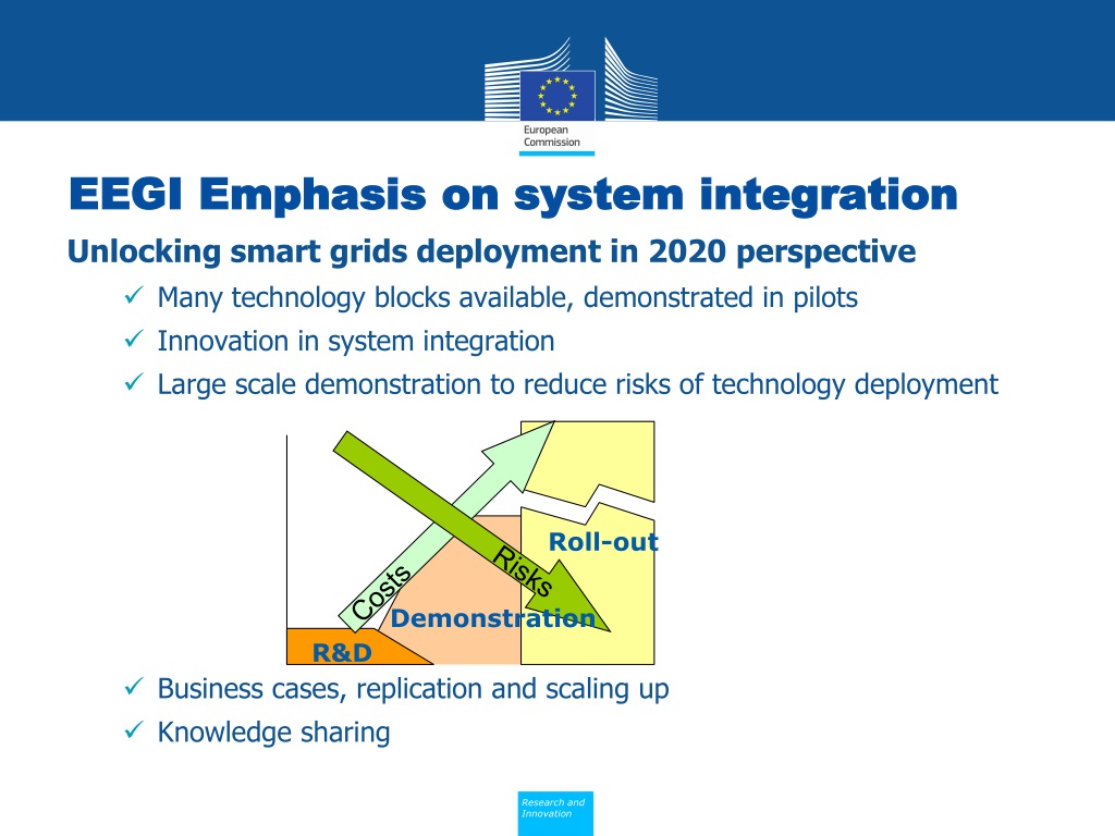 EEGI Emphasis on system integration Unlocking smart grids deployment in 2020 perspective Many technology blocks available, demonstrated in pilots Innovation in system integration Large scale demonstration to reduce risks of technology deployment Business cases, replication and scaling up Knowledge sharing Costs Risks Roll-out Demonstration R&D