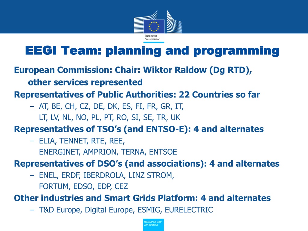EEGI Team: planning and programming European Commission: Chair: Wiktor Raldow (Dg RTD), other services represented Representatives of Public Authorities: 22 Countries so far • AT, BE, CH, CZ, DE, DK, ES, FI, FR, GR, IT, LT, LV, NL, NO, PL, PT, RO, SI, SE, TR, UK Representatives of TSO’s (and ENTSO-E): 4 and alternates • ELIA, TENNET, RTE, REE, ENERGINET, AMPRION, TERNA, ENTSOE Representatives of DSO’s (and associations): 4 and alternates • ENEL, ERDF, IBERDROLA, LINZ STROM,FORTUM, EDSO, EDP, CEZ Other industries and Smart Grids Platform: 4 and alternates • T&D Europe, Digital Europe, ESMIG, EURELECTRIC
