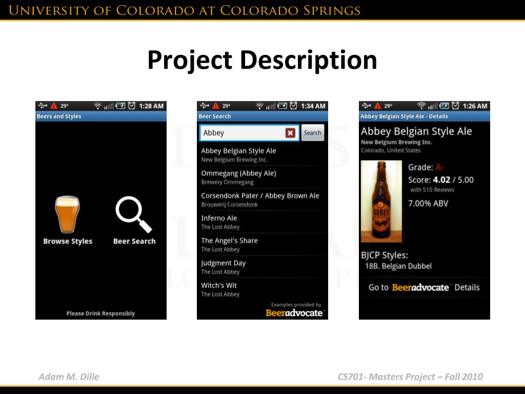 References • [1] How many homebrewers are there in the United States? Talking Points.American Homebrewers Association. http://www.homebrewersassociation.org/pages/government-affairs/talking-points • [2] How many gallons of homebrew in 2009?Forum Topic. Homebrew Talk. http://www.homebrewtalk.com/f14/how-many-gallons-homebrew-2009-a-99440/index184.html • [3] Google Search: ‘beer’ http://www.google.com/search?q=beer • [4] Beer Styles. Beer Advocate. http://beeradvocate.com/beer/style • [5] BJCP Competition Beer Styles. (2008) Beer Judge Certification Program. http://www.bjcp.org/2008styles/catdex.php • [6]Speckmann, B. (2008) The Android Mobile Platform.MSCSMasters Candidacy Review Paper. Department of Computer Science, Eastern Michigan University.http://www.emich.edu/compsci/projects/Master_Thesis_-_Benjamin_Speckmann.pdf • [7]Knutsen, J. (2009) Web Service Clients on Mobile Android Devices. A Study on Architectural Alternatives and Client Performance.MSCS Masters Candidacy Thesis. Norwegian University of Science and Technology Department of Computer and Information Science. http://ntnu.diva-portal.org/smash/get/diva2:348784/FULLTEXT01 • [8]Ableson, F. (2010) Using XML and JSON with Android, Part 1: Explore the benefits of JSON and XML in Android Applications.Technical Library. IBM DeveloperWorks. http://public.dhe.ibm.com/software/dw/xml/x-andbene1/x-andbene1-pdf.pdf • [9] Burns, J. (2008) Developing Secure Mobile Applications For Android. An introduction to making secure Android applications.Technical Publication.iSEC Partners. https://isecpartners.com/files/iSEC_Securing_Android_Apps.pdf