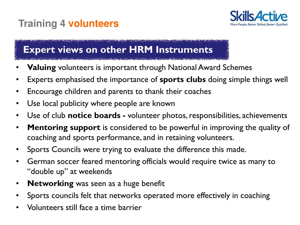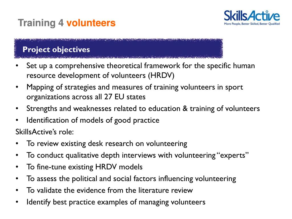 Training 4volunteers Project objectives • Set up a comprehensive theoretical framework for the specific human resource development of volunteers (HRDV) • Mapping of strategies and measures of training volunteers in sport organizations across all 27 EU states • Strengths and weaknesses related to education & training of volunteers • Identification of models of good practice SkillsActive’s role: • To review existing desk research on volunteering • To conduct qualitative depth interviews with volunteering “experts” • To fine-tune existing HRDV models • To assess the political and social factors influencing volunteering • To validate the evidence from the literature review • Identify best practice examples of managing volunteers