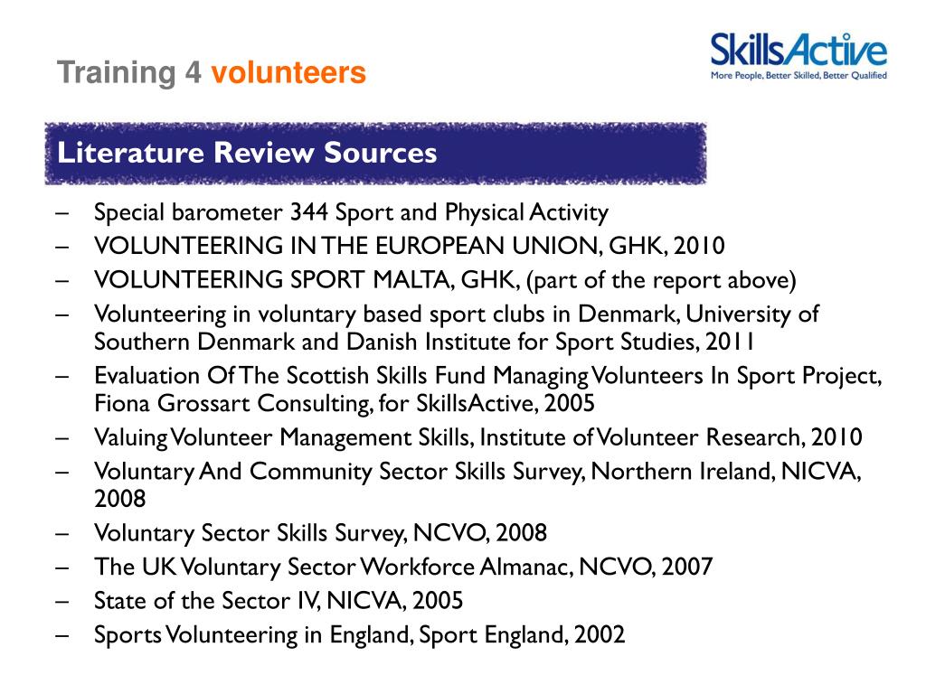 Literature ReviewSources • Special barometer 344 Sport and Physical Activity • VOLUNTEERING IN THE EUROPEAN UNION, GHK, 2010 • VOLUNTEERING SPORT MALTA, GHK, (part of the report above) • Volunteering in voluntarybased sport clubs in Denmark, University of Southern Denmark and Danish Institute for Sport Studies, 2011 • Evaluation Of The Scottish Skills Fund Managing Volunteers In Sport Project, Fiona Grossart Consulting, for SkillsActive, 2005 • Valuing Volunteer Management Skills, Institute of Volunteer Research, 2010 • Voluntary And Community Sector Skills Survey, Northern Ireland, NICVA, 2008 • Voluntary Sector Skills Survey, NCVO, 2008 • The UK Voluntary Sector Workforce Almanac, NCVO, 2007 • State of the Sector IV, NICVA, 2005 • Sports Volunteering in England, Sport England, 2002