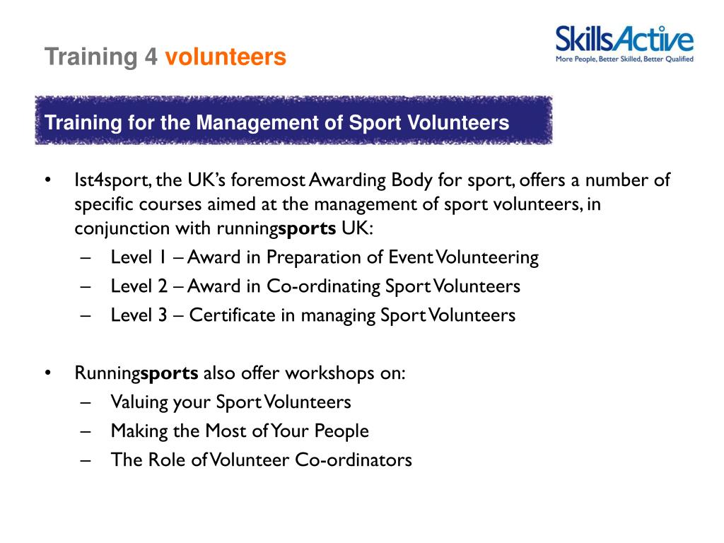 Training for the Management of Sport Volunteers • Ist4sport, the UK’s foremost Awarding Body for sport, offers a number of specific courses aimed at the management of sport volunteers, in conjunction with runningsports UK: • Level 1 – Award in Preparation of Event Volunteering • Level 2 – Award in Co-ordinating Sport Volunteers • Level 3 – Certificate in managing Sport Volunteers • Runningsports also offer workshops on: • Valuing your Sport Volunteers • Making the Most of Your People • The Role of Volunteer Co-ordinators