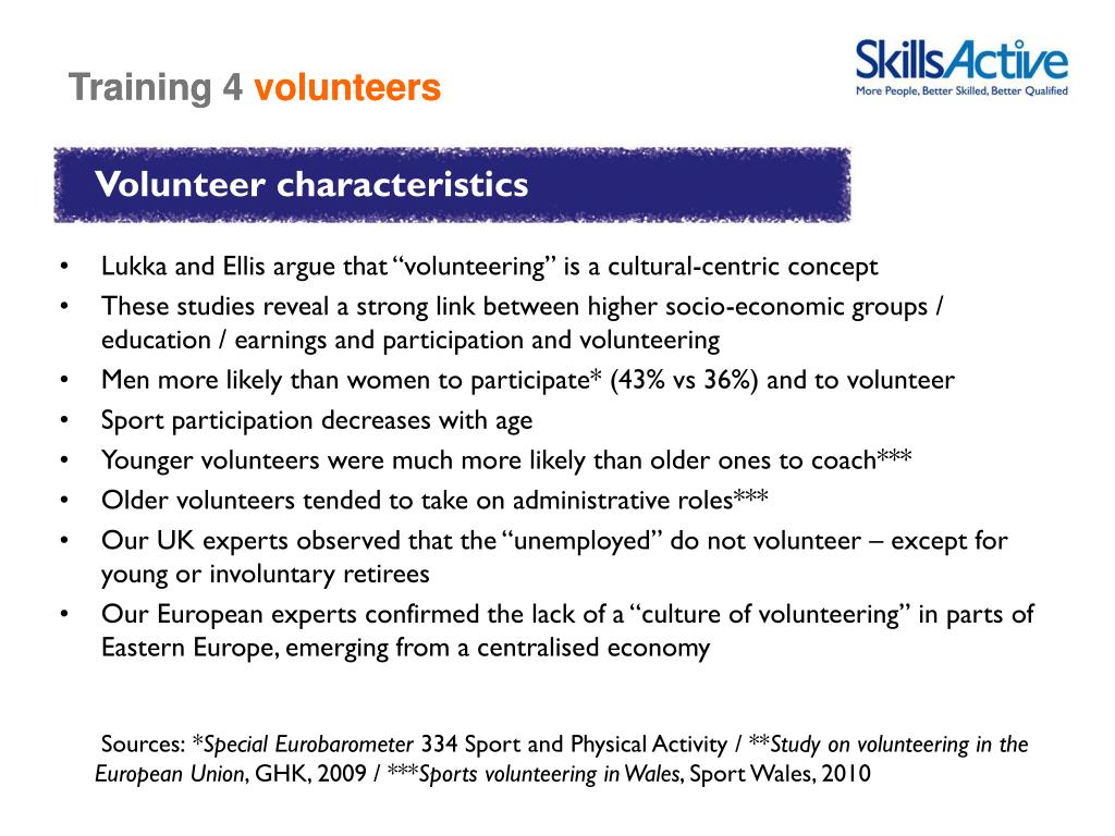 Training 4volunteers Volunteer characteristics • Lukka and Ellis argue that “volunteering” is a cultural-centric concept • These studies reveal a strong link between higher socio-economic groups / education / earnings and participation and volunteering • Men more likely than women to participate* (43% vs 36%) and to volunteer • Sport participation decreases with age • Younger volunteers were much more likely than older ones to coach*** • Older volunteers tended to take on administrative roles*** • Our UK experts observed that the “unemployed” do not volunteer – except for young or involuntary retirees • Our European experts confirmed the lack of a “culture of volunteering”in parts of Eastern Europe, emerging from a centralised economy Sources:*Special Eurobarometer 334 Sport and Physical Activity / **Study on volunteering in the European Union, GHK, 2009 / ***Sports volunteering in Wales, Sport Wales, 2010