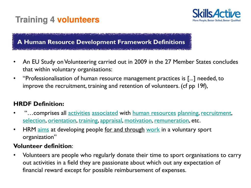 Training 4volunteers A Human Resource Development Framework Definitions • An EU Study on Volunteering carried out in 2009 in the 27 Member States concludes that within voluntary organisations: • “Professionalisation of human resource management practices is [...] needed, to improve the recruitment, training and retention of volunteers. (cf pp 19f), HRDF Definition: • “…comprises all activitiesassociated with human resourcesplanning, recruitment, selection, orientation, training, appraisal, motivation, remuneration, etc. • HRM aims at developing people for and throughwork in a voluntary sport organization” Volunteer definition: • Volunteers are people who regularly donate their time to sport organisations to carry out activities in a field they are passionate about which out any expectation of financial reward except for possible reimbursement of expenses.