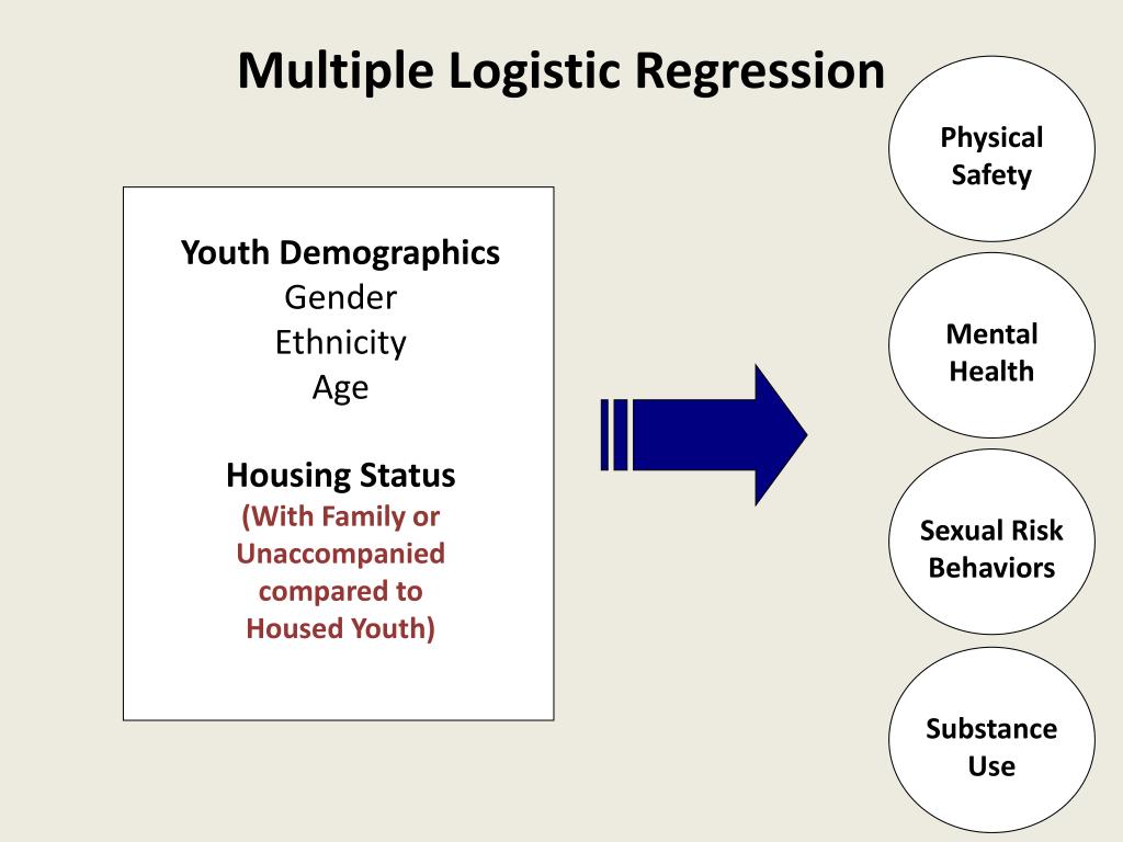 Multiple Logistic Regression Physical Safety Mental Health Sexual Risk Behaviors Substance Use Youth Demographics GenderEthnicity Age Housing Status (With Family or Unaccompanied compared to Housed Youth)