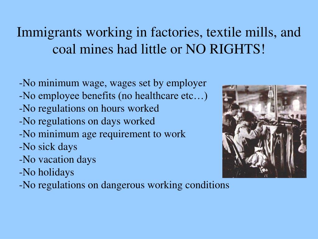 Immigrants working in factories, textile mills, and coal mines had little or NO RIGHTS! • No minimum wage, wages set by employer • No employee benefits (no healthcare etc…) • No regulations on hours worked • No regulations on days worked • No minimum age requirement to work • No sick days • No vacation days • No holidays • No regulations on dangerous working conditions