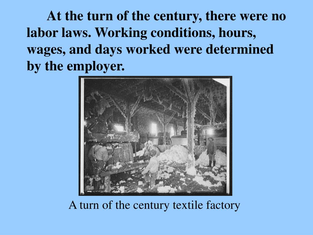 At the turn of the century, there were no labor laws. Working conditions, hours, wages, and days worked were determined by the employer. A turn of the century textile factory