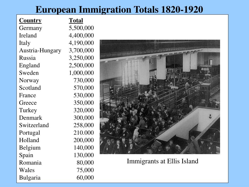European Immigration Totals 1820-1920 CountryTotalGermany 5,500,000Ireland 4,400,000Italy 4,190,000Austria-Hungary 3,700,000Russia 3,250,000England 2,500,000Sweden 1,000,000Norway 730,000Scotland 570,000France 530,000Greece 350,000Turkey 320,000Denmark 300,000Switzerland 258,000Portugal 210.000Holland 200,000Belgium 140,000Spain 130,000Romania 80,000Wales 75,000Bulgaria 60,000 Immigrants at Ellis Island