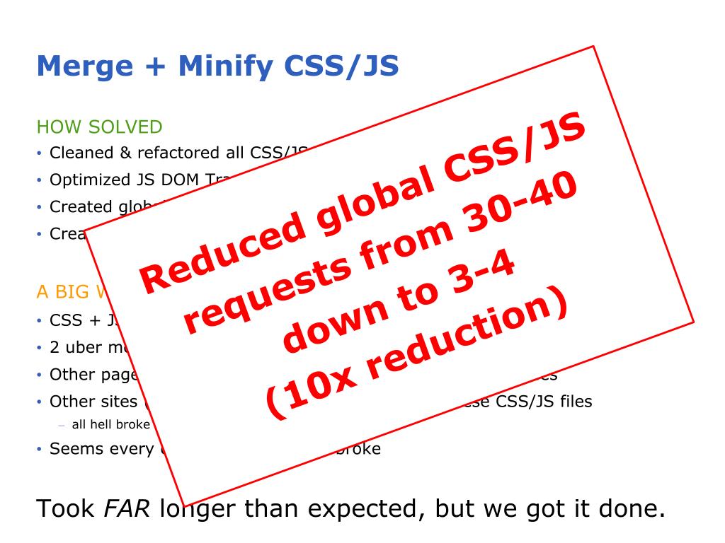 Merge + Minify CSS/JS HOW SOLVED • Cleaned & refactored all CSS/JS • Optimized JS DOM Traversals • Created global-global mergeset (shared across all sites) • Created site-global mergesets (shared across all pages of same-site) A BIG WIN, BUT WITH SOME COST • CSS + JS containment extremely tedious • 2 ubermergesets == lots of unused code on most pages • Other pages aside from our top-50 included these CSS/JS files • Other sites (outside of our 6 sites) also included these CSS/JS files • all hell broke loose • Seems every commit, more things broke Took FAR longer than expected, but we got it done. Reduced global CSS/JS requests from 30-40 down to 3-4 (10x reduction)