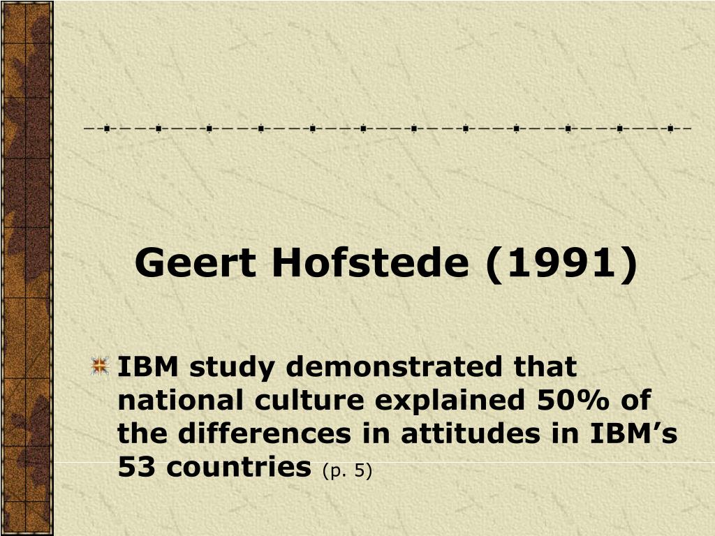 Geert Hofstede (1991) • IBM study demonstrated that national culture explained 50% of the differences in attitudes in IBM’s 53 countries (p. 5)