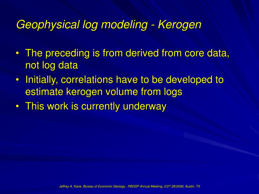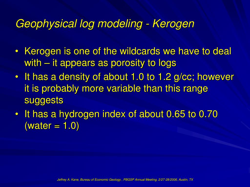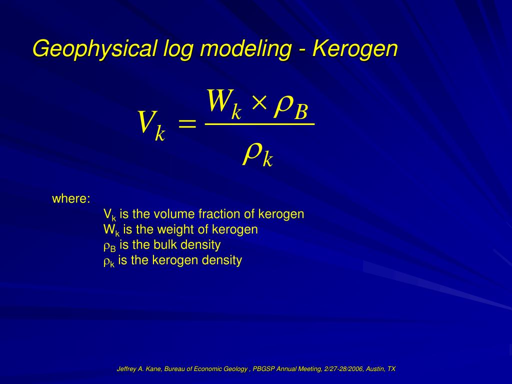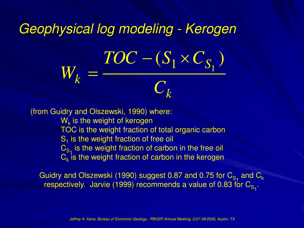 Geophysical log modeling - Kerogen (from Guidry and Olszewski, 1990) where: Wk is the weight of kerogen TOC is the weight fraction of total organic carbon S1 is the weight fraction of free oil CS1 is the weight fraction of carbon in the free oil Ck is the weight fraction of carbon in the kerogen Guidry and Olszewski (1990) suggest 0.87 and 0.75 for CS1 and Ck respectively. Jarvie (1999) recommends a value of 0.83 for CS1. Jeffrey A. Kane, Bureau of Economic Geology , PBGSP Annual Meeting, 2/27-28/2006, Austin, TX