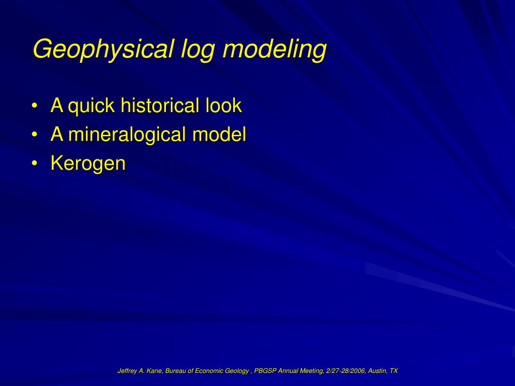 Geophysical log modeling • A quick historical look • A mineralogical model • Kerogen Jeffrey A. Kane, Bureau of Economic Geology , PBGSP Annual Meeting, 2/27-28/2006, Austin, TX