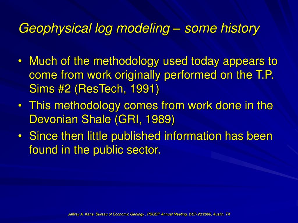 Geophysical log modeling – some history • Much of the methodology used today appears to come from work originally performed on the T.P. Sims #2 (ResTech, 1991) • This methodology comes from work done in the Devonian Shale (GRI, 1989) • Since then little published information has been found in the public sector. Jeffrey A. Kane, Bureau of Economic Geology , PBGSP Annual Meeting, 2/27-28/2006, Austin, TX