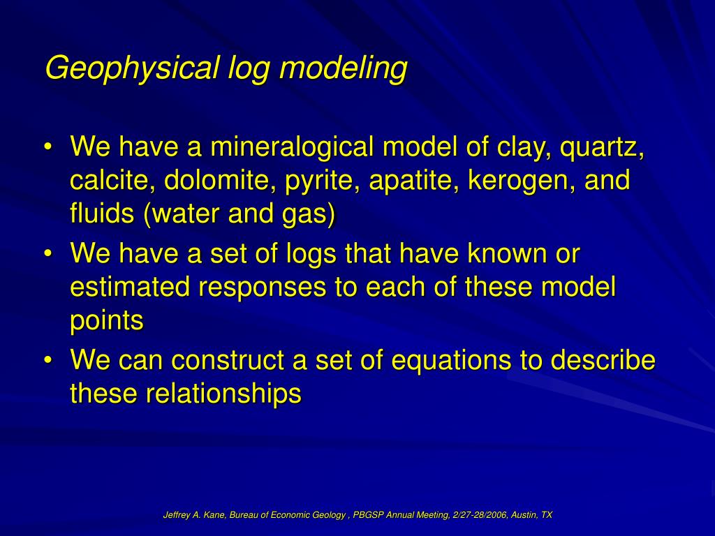 Geophysical log modeling • We have a mineralogical model of clay, quartz, calcite, dolomite, pyrite, apatite, kerogen, and fluids (water and gas) • We have a set of logs that have known or estimated responses to each of these model points • We can construct a set of equations to describe these relationships Jeffrey A. Kane, Bureau of Economic Geology , PBGSP Annual Meeting, 2/27-28/2006, Austin, TX