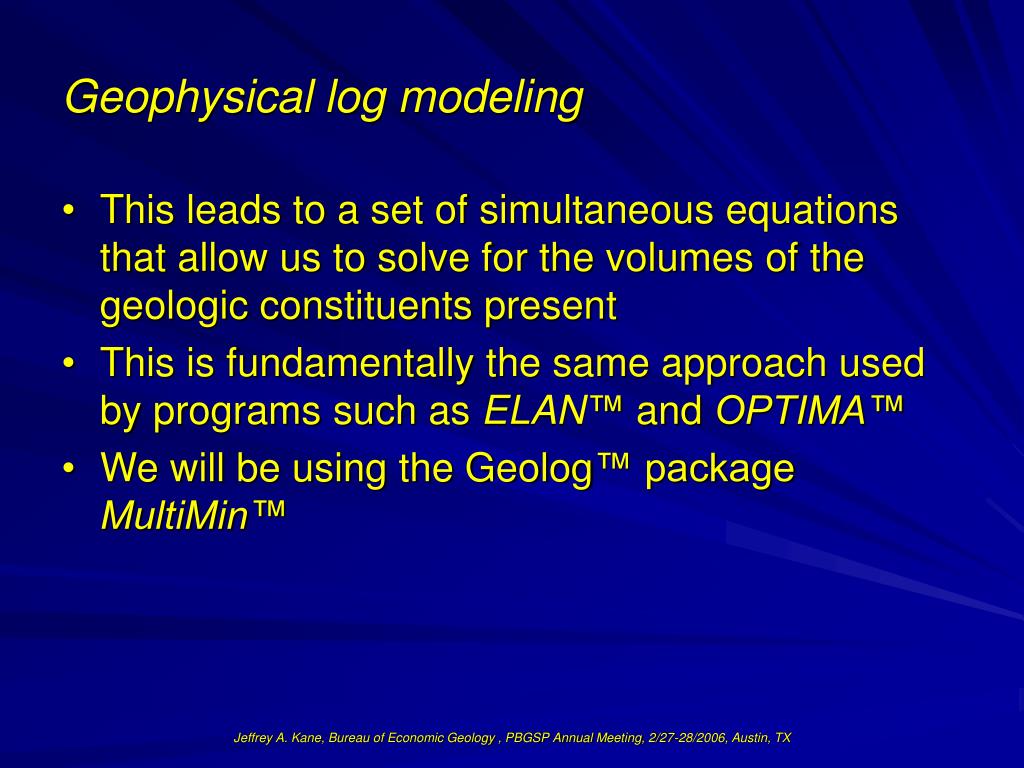 Geophysical log modeling • This leads to a set of simultaneous equations that allow us to solve for the volumes of the geologic constituents present • This is fundamentally the same approach used by programs such as ELAN™ and OPTIMA™ • We will be using the Geolog™ package MultiMin™ Jeffrey A. Kane, Bureau of Economic Geology , PBGSP Annual Meeting, 2/27-28/2006, Austin, TX