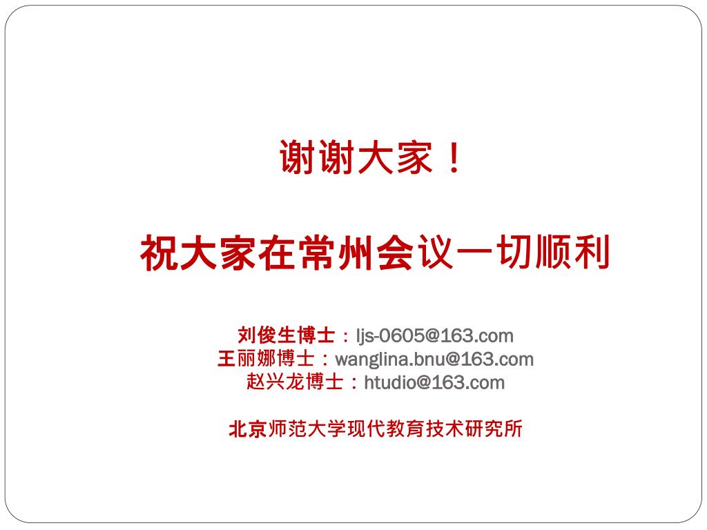 谢谢大家!祝大家在常州会议一切顺利刘俊生博士:ljs-0605@163.com王丽娜博士:wanglina.bnu@163.com赵兴龙博士:htudio@163.com北京师范大学现代教育技术研究所谢谢大家!祝大家在常州会议一切顺利刘俊生博士:ljs-0605@163.com王丽娜博士:wanglina.bnu@163.com赵兴龙博士:htudio@163.com北京师范大学现代教育技术研究所