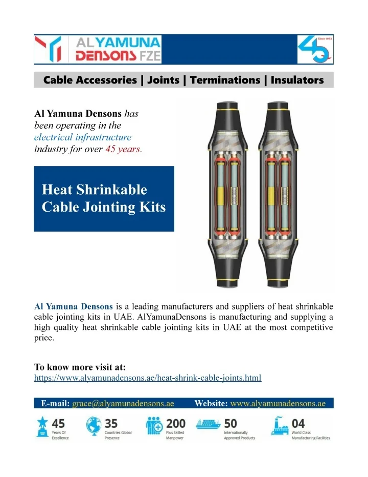 AlYamunaDensons is a leading Heat Shrinkable Cable Jointing kits suppliers in UAE, which supplying a extensive range of Heat Shrinkable Cable Jointing Kits in UAE at the most competitive price. To know more visit at https://www.alyamunadensons.ae/heat-shrink-cable-joints.html