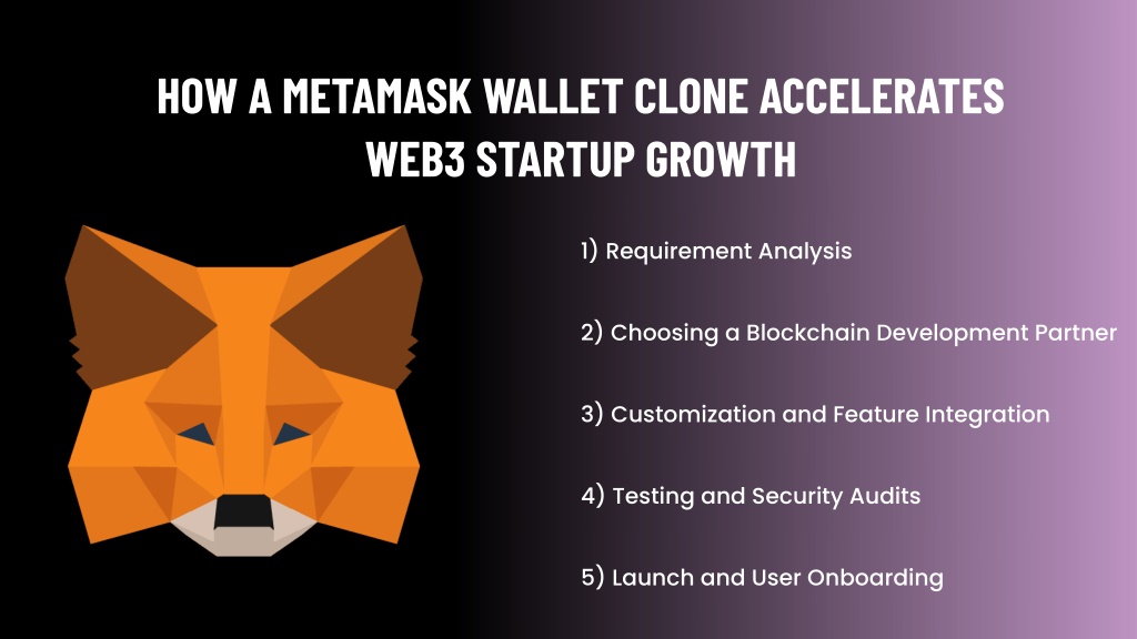 HOW A METAMASK WALLET CLONE ACCELERATES WEB3 STARTUP GROWTH 1) Requirement Analysis 2) Choosing a Blockchain Development Partner 3) Customization and Feature Integration 4) Testing and Security Audits 5) Launch and User Onboarding