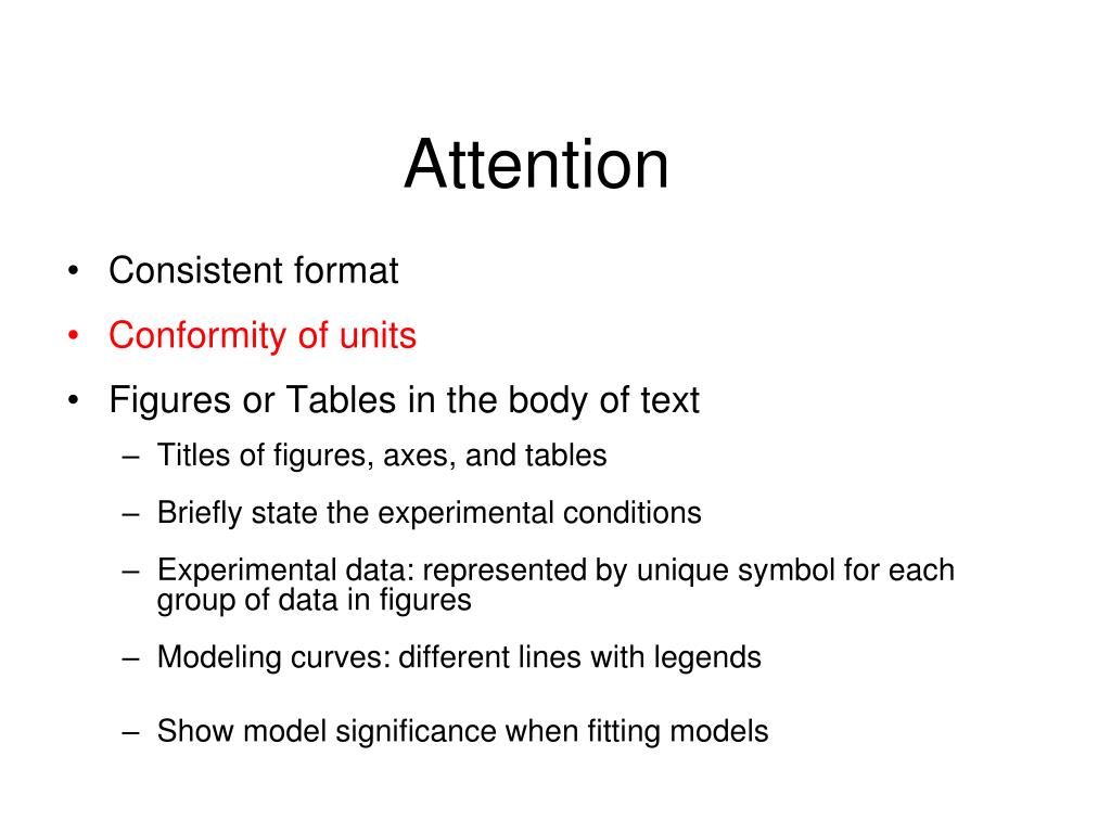 Attention • Consistent format • Conformity of units • Figures or Tables in the body of text • Titles of figures, axes, and tables • Briefly state the experimental conditions • Experimental data: represented by unique symbol for each group of data in figures • Modeling curves: different lines with legends • Show model significance when fitting models