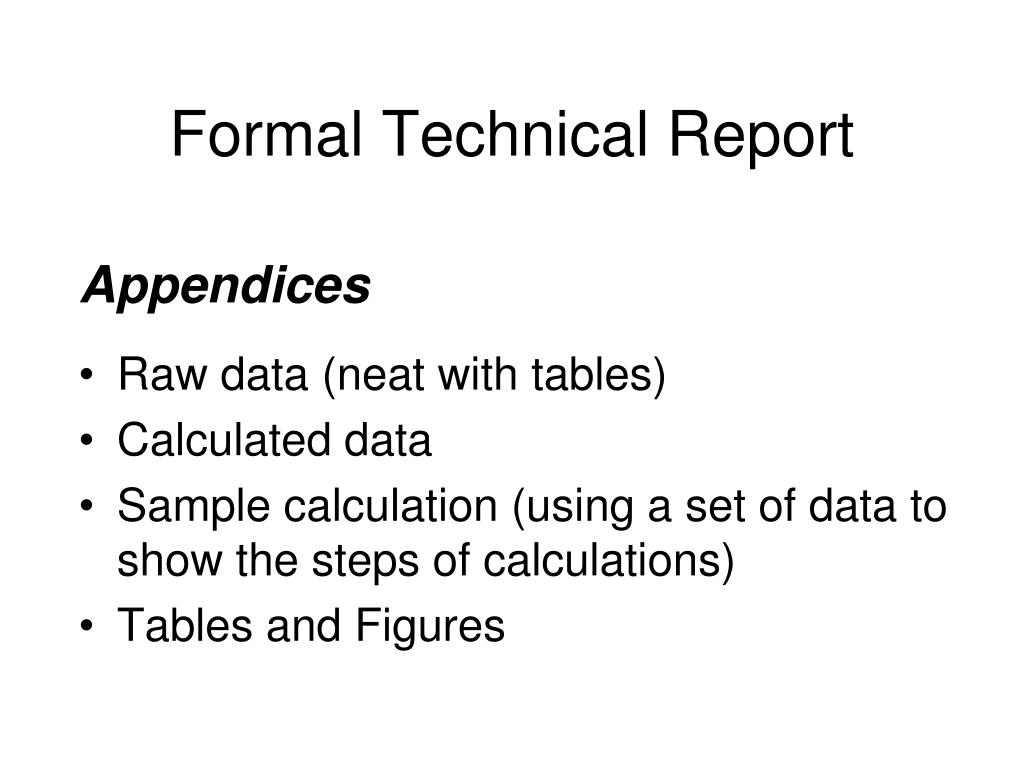 Formal Technical Report Appendices • Raw data (neat with tables) • Calculated data • Sample calculation (using a set of data to show the steps of calculations) • Tables and Figures