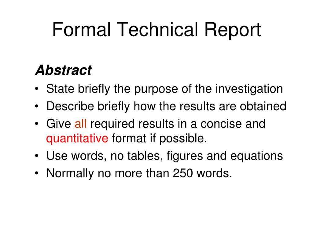 Formal Technical Report Abstract • State briefly the purpose of the investigation • Describe briefly how the results are obtained • Give all required results in a concise and quantitative format if possible. • Use words, no tables, figures and equations • Normally no more than 250 words.