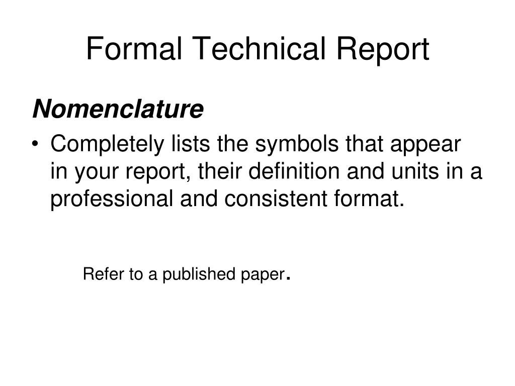 Formal Technical Report Nomenclature • Completely lists the symbols that appear in your report, their definition and units in a professional and consistent format. Refer to a published paper.