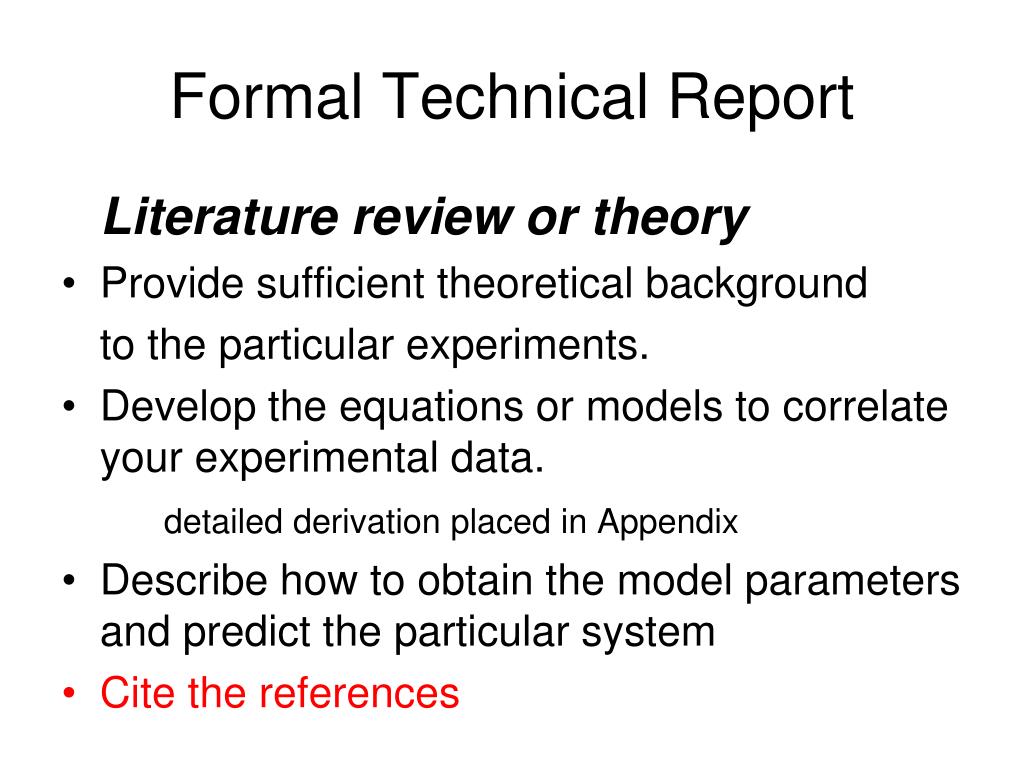 Formal Technical Report Literature review or theory • Provide sufficient theoretical background to the particular experiments. • Develop the equations or models to correlate your experimental data. detailed derivation placed in Appendix • Describe how to obtain the model parameters and predict the particular system • Cite the references