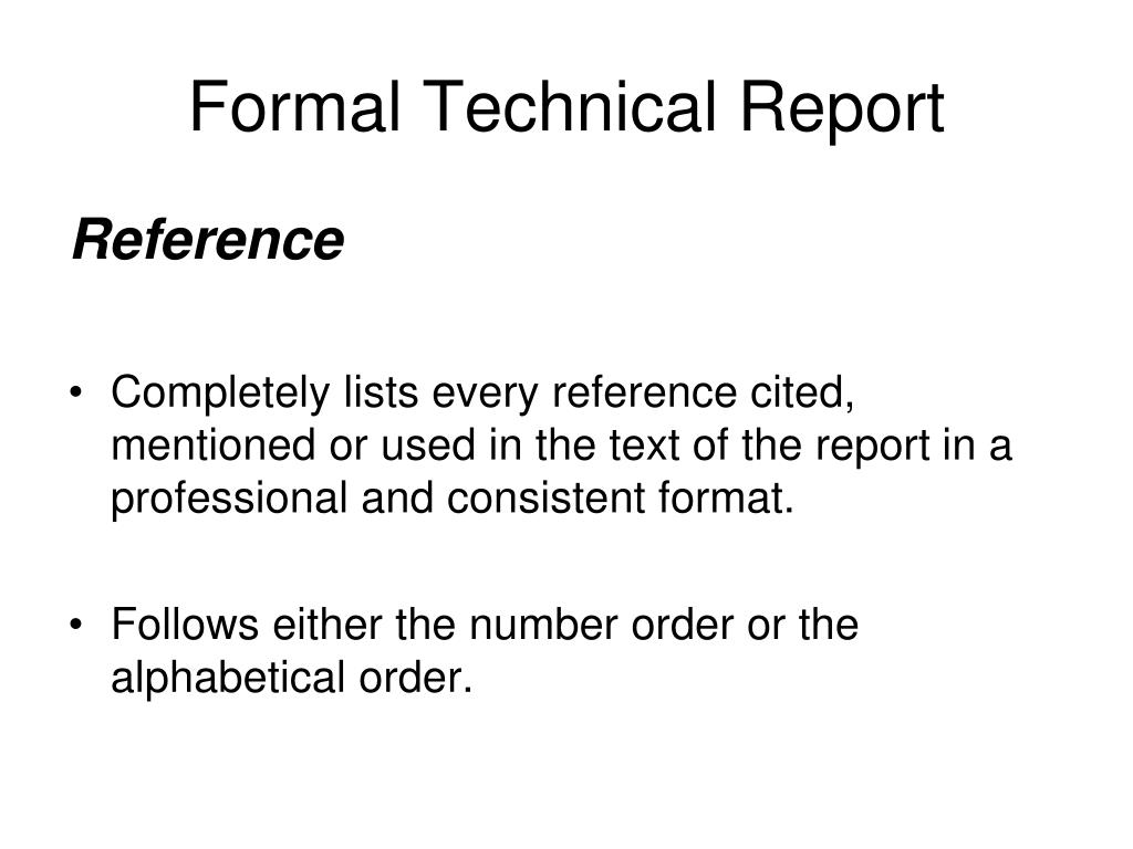 Formal Technical Report Reference • Completely lists every reference cited, mentioned or used in the text of the report in a professional and consistent format. • Follows either the number order or the alphabetical order.