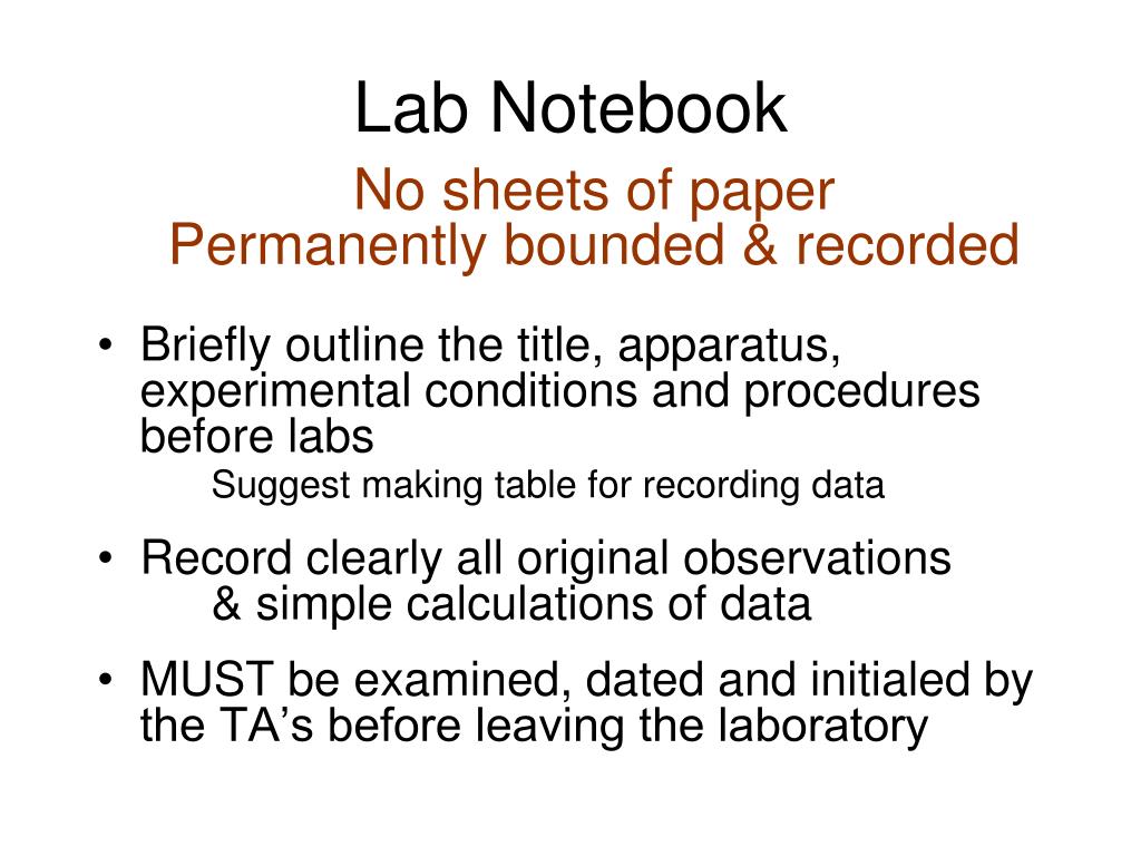 Lab Notebook No sheets of paper Permanently bounded & recorded • Briefly outline the title, apparatus, experimental conditions and procedures before labs Suggest making table for recording data • Record clearly all original observations & simple calculations of data • MUST be examined, dated and initialed by the TA’s before leaving the laboratory