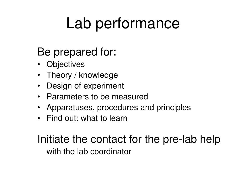 Lab performance Be prepared for: • Objectives • Theory / knowledge • Design of experiment • Parameters to be measured • Apparatuses, procedures and principles • Find out: what to learn Initiate the contact for the pre-lab help with the lab coordinator