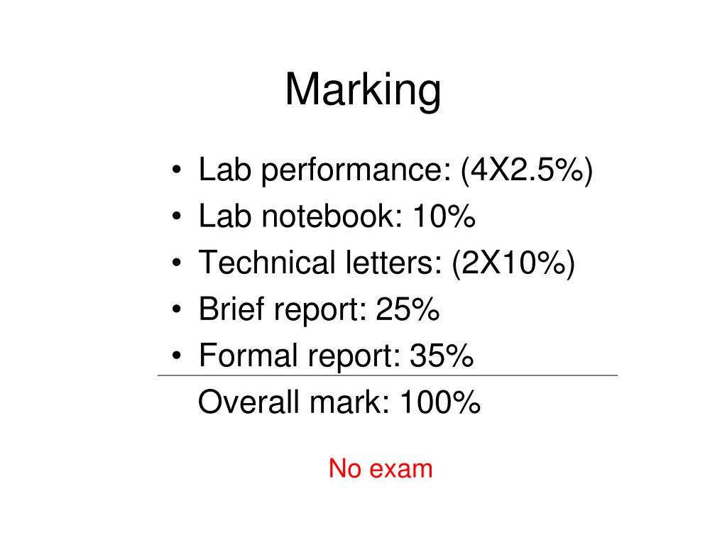 Marking • Lab performance: (4X2.5%) • Lab notebook: 10% • Technical letters: (2X10%) • Brief report: 25% • Formal report: 35% Overall mark: 100% No exam