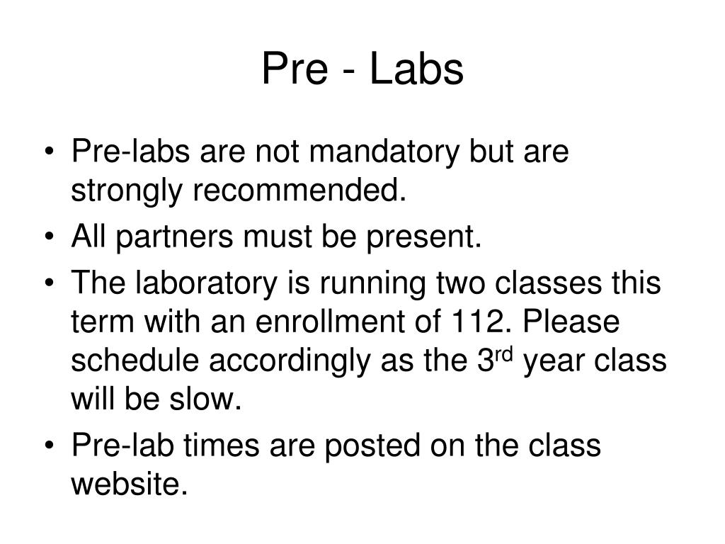 Pre - Labs • Pre-labs are not mandatory but are strongly recommended. • All partners must be present. • The laboratory is running two classes this term with an enrollment of 112. Please schedule accordingly as the 3rd year class will be slow. • Pre-lab times are posted on the class website.
