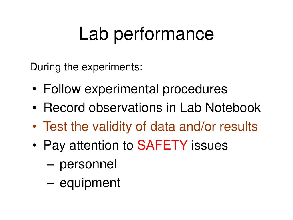Lab performance During the experiments: • Follow experimental procedures • Record observations in Lab Notebook • Test the validity of data and/or results • Pay attention to SAFETY issues • personnel • equipment