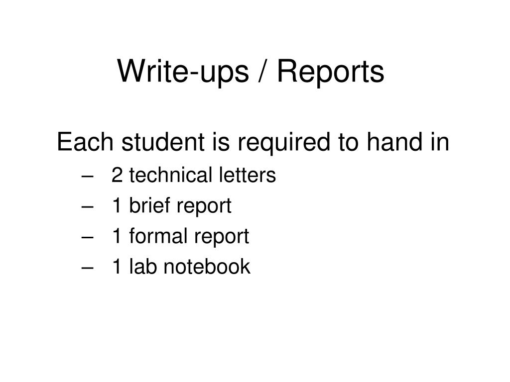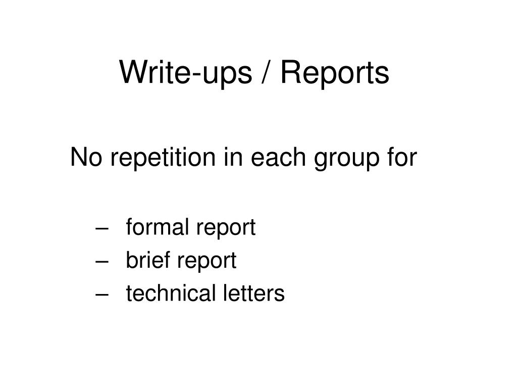 Write-ups / Reports • No repetition in each group for • formal report • brief report • technical letters