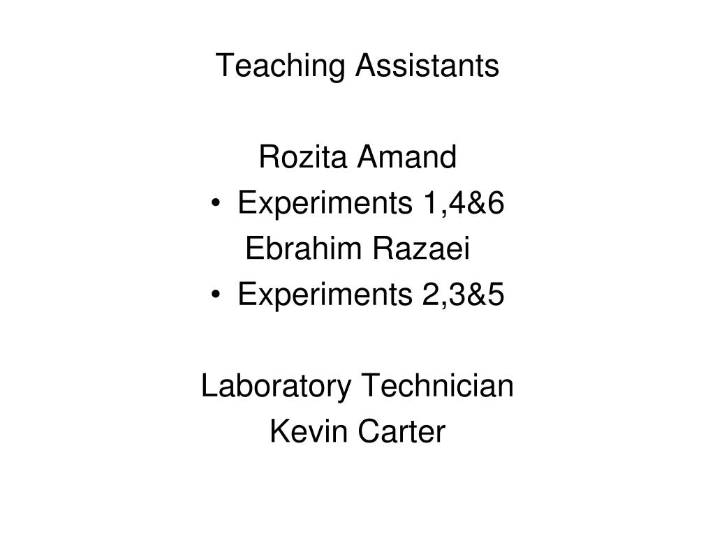 Teaching Assistants RozitaAmand • Experiments 1,4&6 Ebrahim Razaei • Experiments 2,3&5 Laboratory Technician Kevin Carter