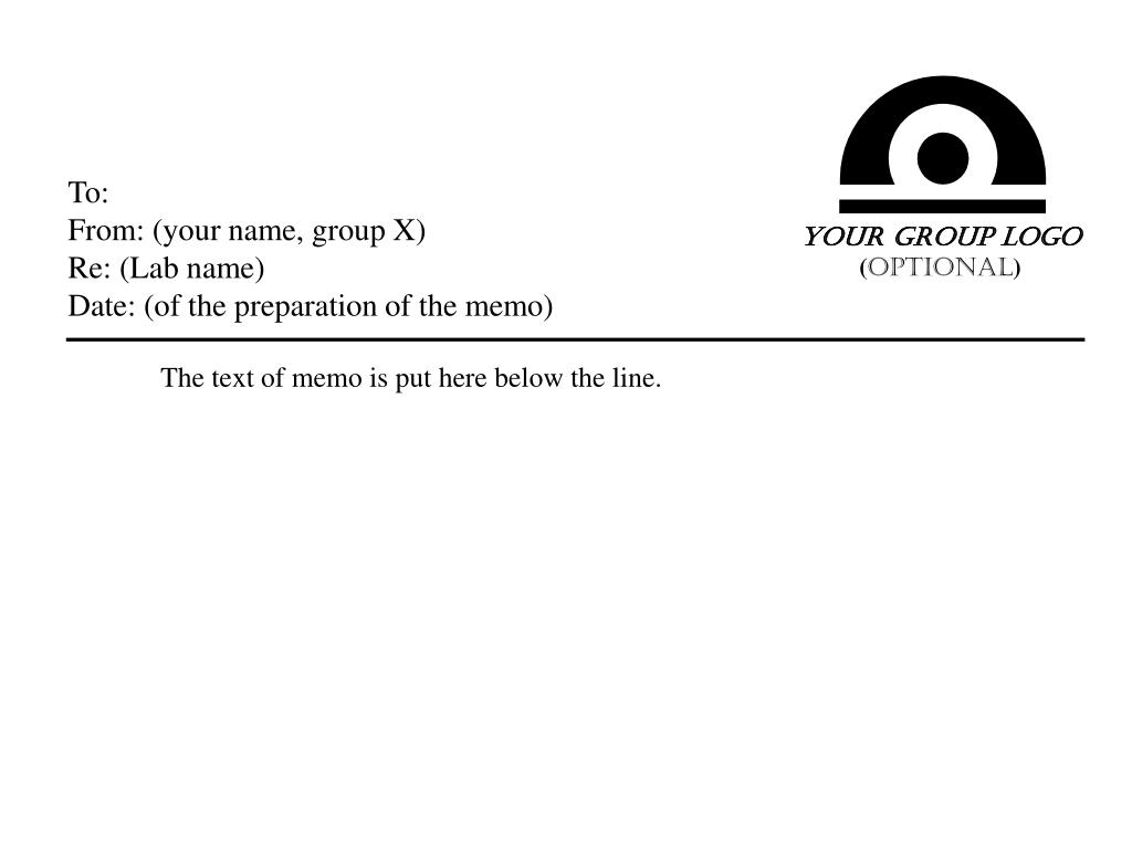 To: From: (your name, group X) Re: (Lab name) Date: (of the preparation of the memo) Your group logo (optional) The text of memo is put here below the line.