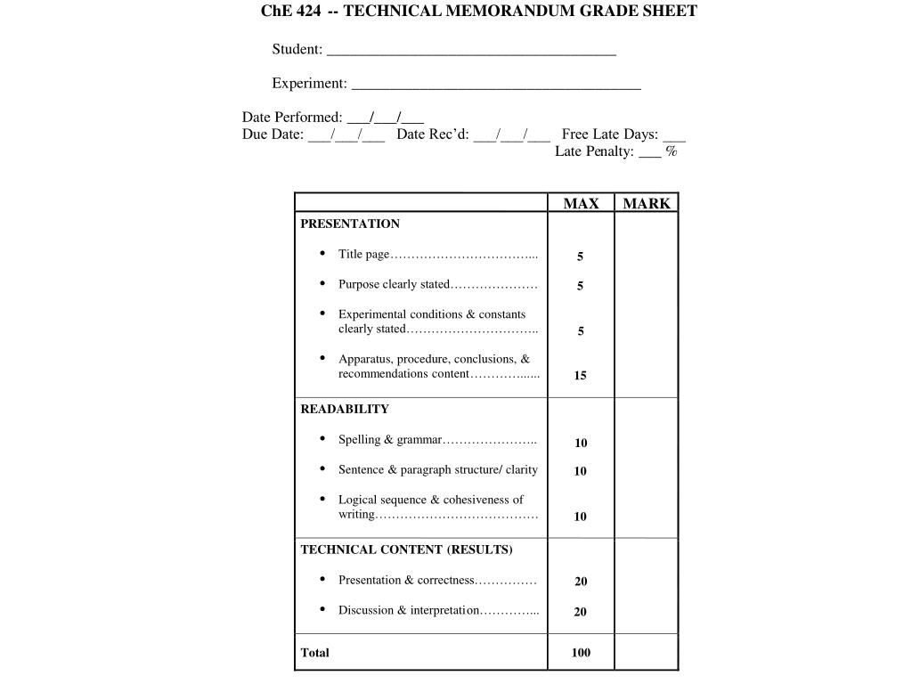 ChE 424 -- TECHNICAL MEMORANDUM GRADE SHEET Student: ______________________________________ Experiment: ______________________________________ Date Performed: ___/___/___ Due Date: ___/___/___ Date Rec’d: ___/___/___ Free Late Days: ___ Late Pe nalty: ___ % MAX MARK PRESENTATION · Title page ……………………………... 5 · Purpose clearly stated………………… 5 · Experimental conditions & constants clearly stated………………………….. 5 · Apparatus, procedure, conclusions, & recommendations co ntent …………... ... 1 5 READABILITY · Spelling & grammar………………….. 10 · Sentence & paragraph structure/ clarity 10 · Logical sequence & cohesiveness of writing………………………………… 10 TECHNICAL CONTENT (RESULTS) · Presentation & correctness…………… 20 · Discussion & interpretati on…………... 20 Total 100