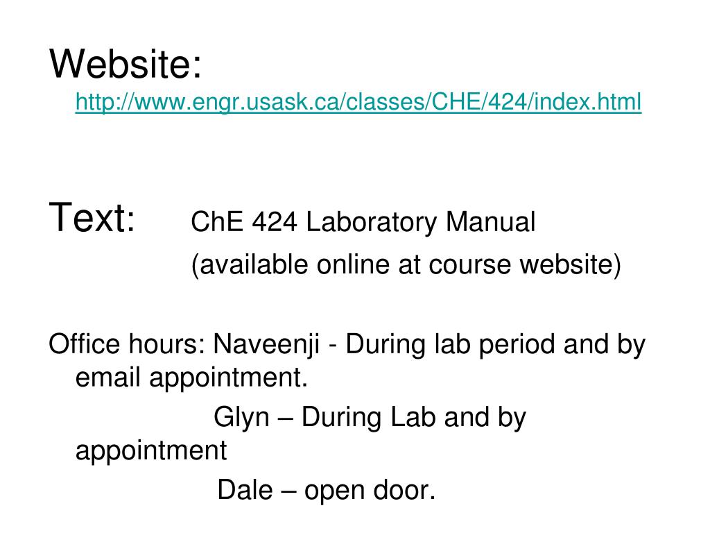 Website:http://www.engr.usask.ca/classes/CHE/424/index.html Text: ChE 424 Laboratory Manual (available online at course website) Office hours: Naveenji - During lab period and by email appointment. Glyn – During Lab and by appointment Dale – open door.