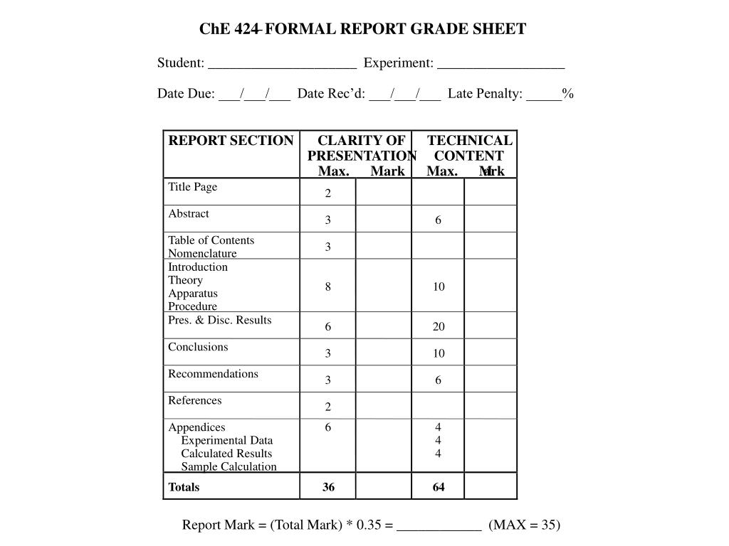 ChE 424 – FORMAL REPORT GRADE SHEET Student: _____________________ Experiment: __________________ Date Due: ___/___/___ Date Rec’d: ___/___/___ Late Penalty: _____% REPORT SECTION CLARITY OF TECHNICAL PRESENTATION CONTENT Max. Mark Max. M ark Title Page 2 Abstract 3 6 Table of Contents 3 Nomenclature Introduction Theory 8 10 Apparatus Procedure Pres. & Disc. Results 6 20 Conclusions 3 10 Recommendations 3 6 References 2 Appendices 6 4 Experimental Data 4 Calculated Results 4 Sample Calculation Totals 36 64 Report Mark = (Total Mark) * 0.35 = ____________ (MAX = 35)