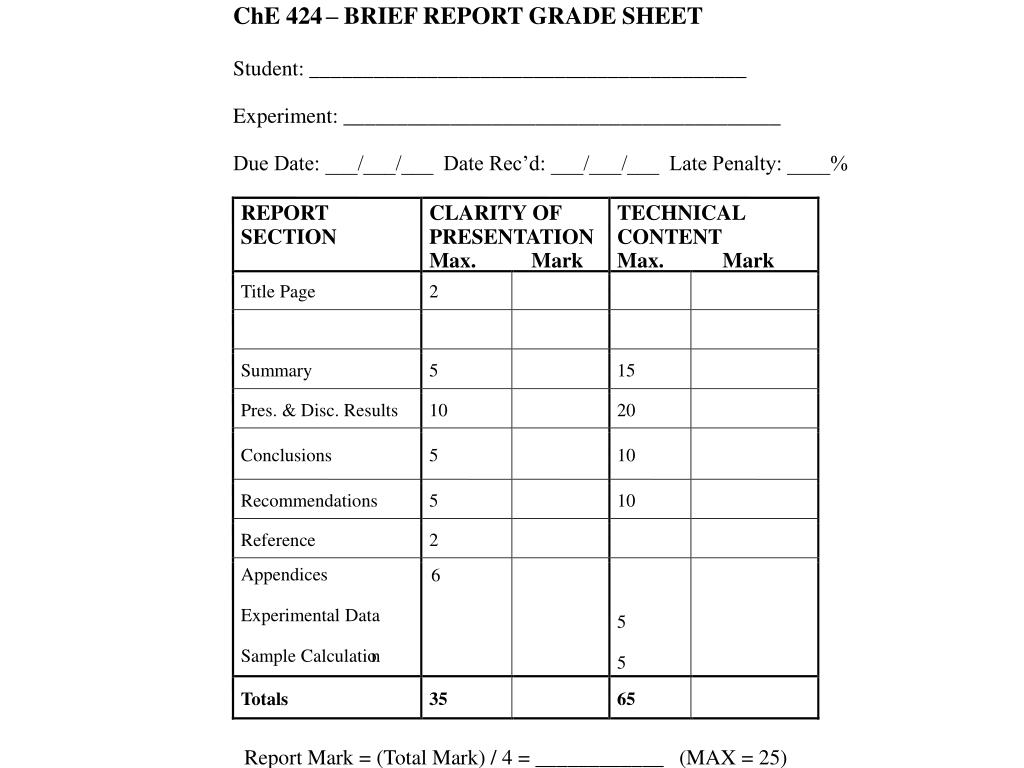 ChE 424 – BRIEF REPORT GRADE SHEET Student: _________________________________________ Experiment: _________________________________________ Due Date: ___/___/___ Date Rec’d: ___/___/___ Late Penalty: ____% REPORT CLARITY OF TECHNICAL SECTION PRESENTATION CONTENT Max. Mark Max. Mark Title Page 2 Summary 5 15 Pres. & Disc. Results 10 20 Conclusions 5 10 Recommendations 5 10 Reference 2 Appendices 6 Experimental Data 5 Sample Calculatio n 5 Totals 35 65 Report Mark = (Total Mark) / 4 = ____________ (MAX = 25)