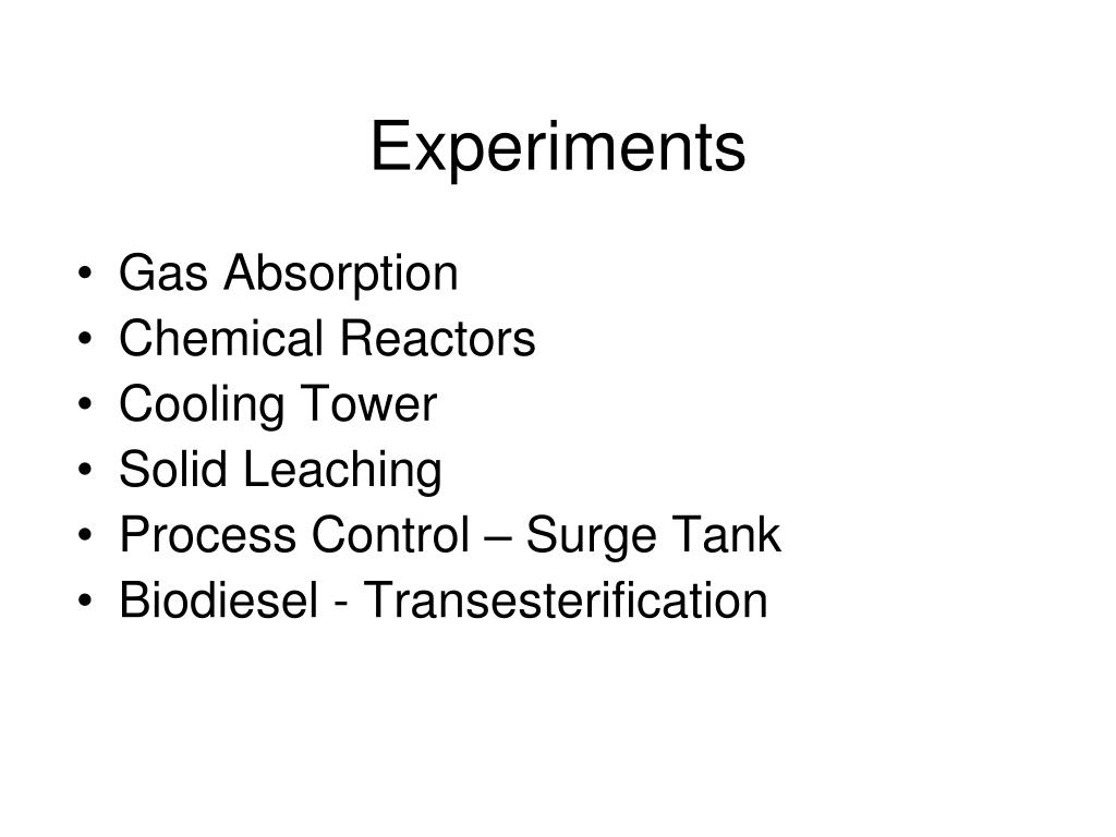 Experiments • Gas Absorption • Chemical Reactors • Cooling Tower • Solid Leaching • Process Control – Surge Tank • Biodiesel - Transesterification