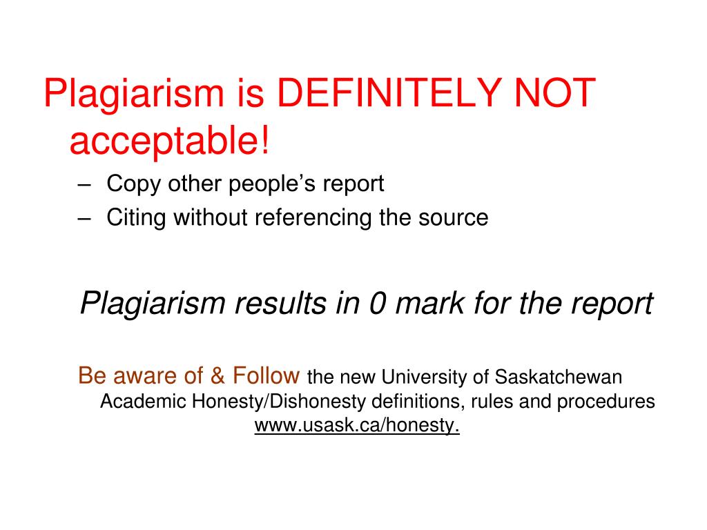 Plagiarism is DEFINITELY NOT acceptable! • Copy other people’s report • Citing without referencing the source Plagiarism results in 0 mark for the report Be aware of & Followthe new University of Saskatchewan Academic Honesty/Dishonesty definitions, rules and procedures www.usask.ca/honesty.
