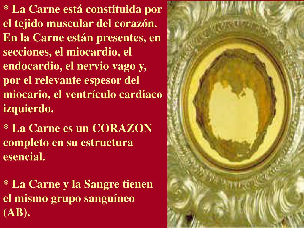 * La Carne está constituida por el tejido muscular del corazón. En la Carne están presentes, en secciones, el miocardio, el endocardio, el nervio vago y, por el relevante espesor del miocario, el ventrículo cardiaco izquierdo. * La Carne es un CORAZON completo en su estructura esencial. * La Carne y la Sangre tienen el mismo grupo sanguíneo (AB).